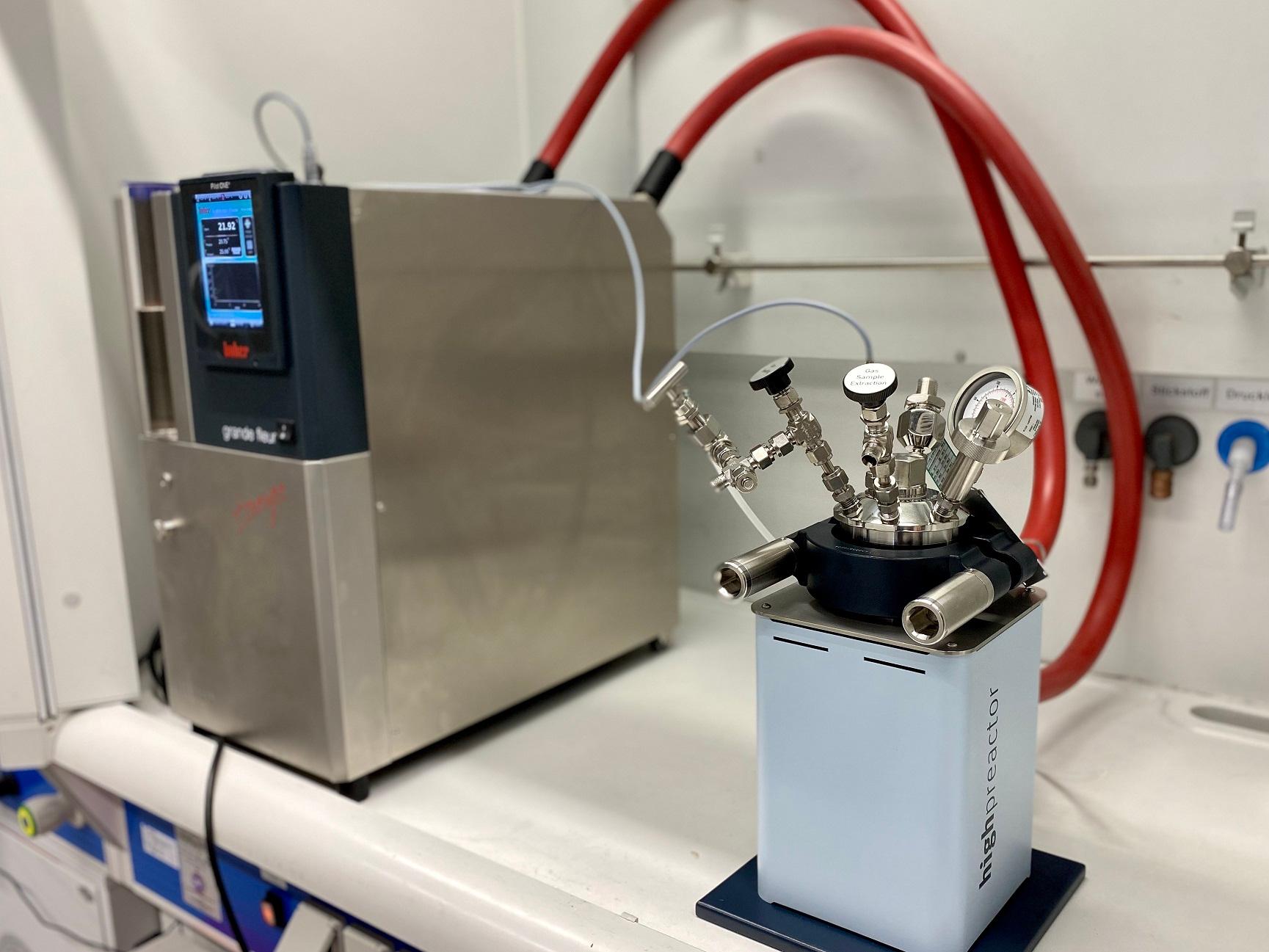 Laboraufbau der Kavernenbedingungen_ Hochdrucktestreaktor (rechts) mit Temperiereinheit (links) zur Nachbildung von Druck, Temperatur und WasserstoffatmosphäreBild: DLR (CC BY-NC-ND 3.0)