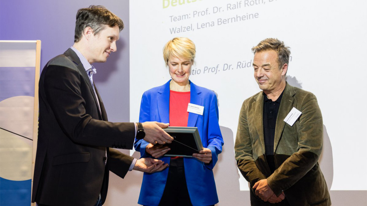 DSHS1Bild: Dr. Verena Römisch (mitte) und Prof. Dr. Ralf Roth (rechts) nehmen den Humboldtn-Preis für Nachhaltigkeit 2025 in Empfang | Malte Reiter Fotografie