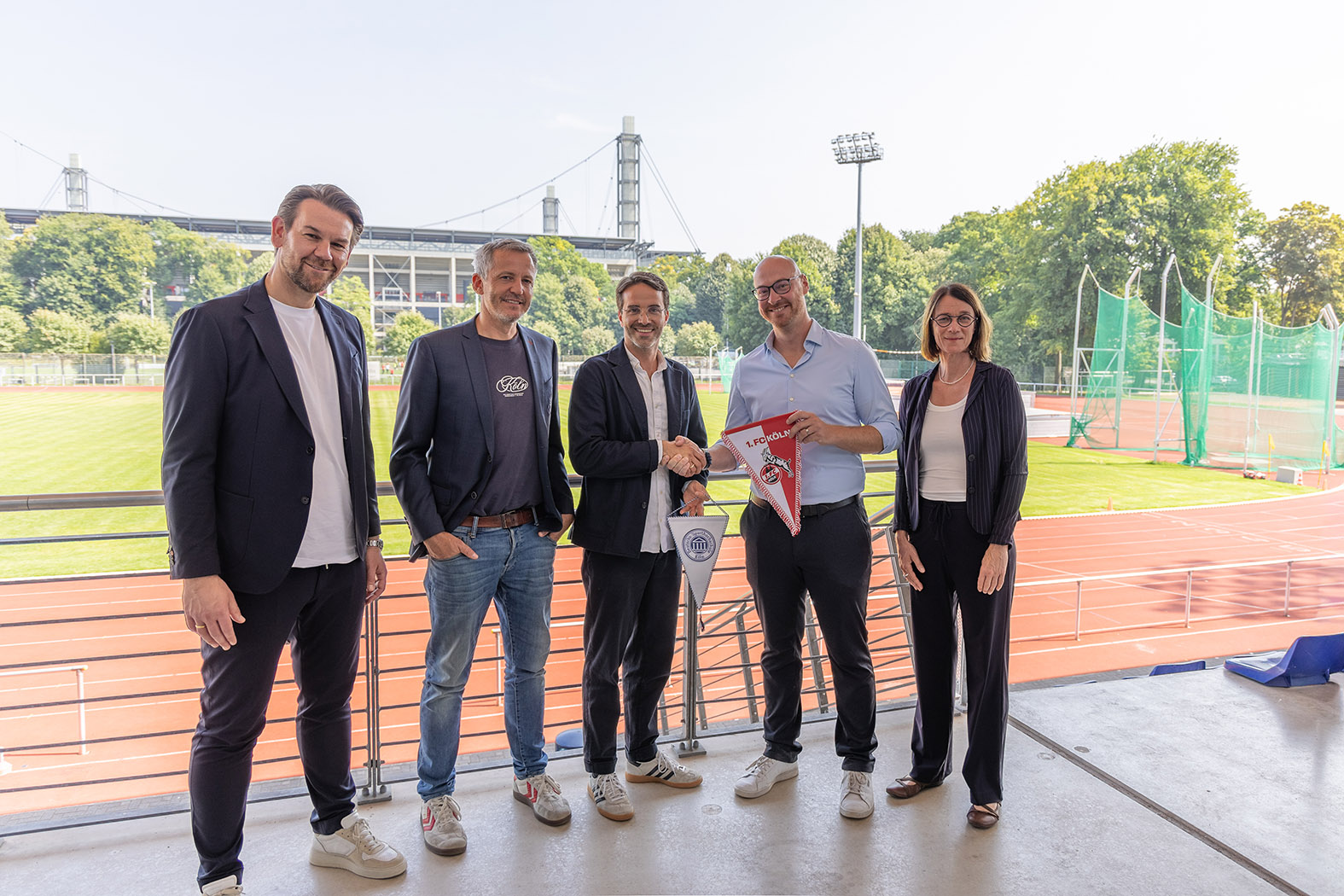 FC_DSHS_Gruppenfoto_webBild: : v.l.: Thomas Kessler (FC-Sportdirektor), Philipp Türoff (FC-Geschäftsführer Finanzen und Administration), Philipp Liesenfeld (FC-Geschäftsführer Marketing und Vertrieb), Prof. Tobias Vogt (DSHS-Prorektor Forschung und Transfer ), Prof.‘in Bettina Rulofs (DSHS-Prorektorin Studium, Lehre und Weiterbildung) | Deutsche Sporthochschule Köln